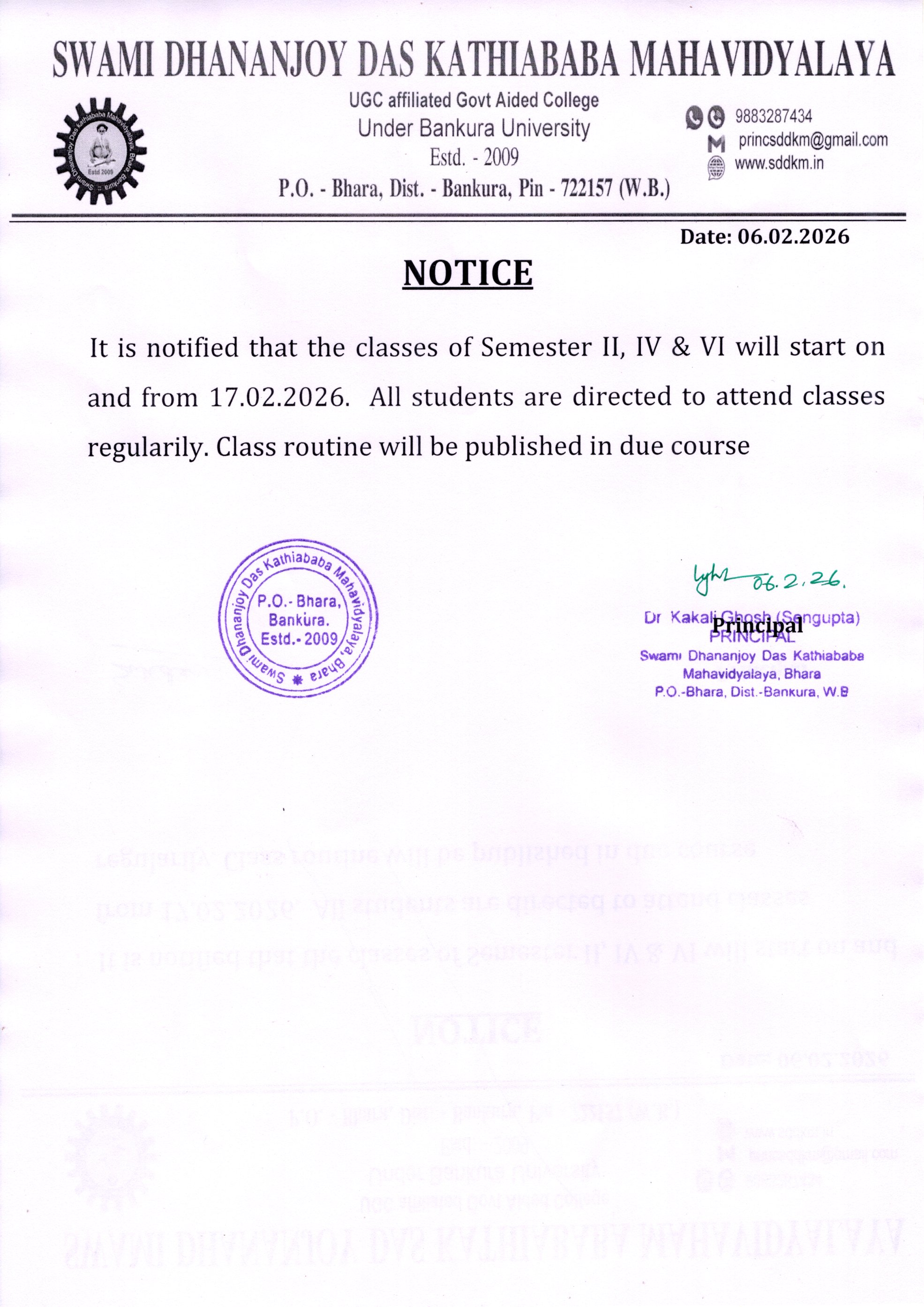 Semester II, IV & VI Class Start