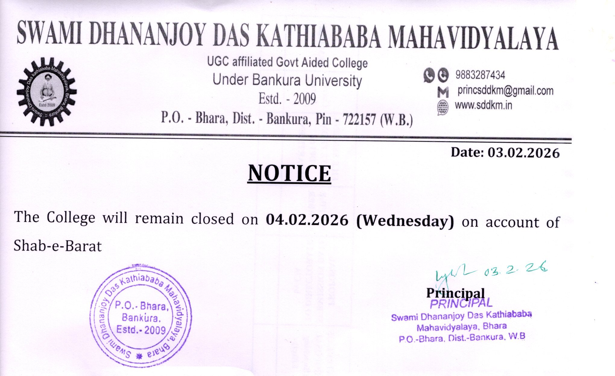 Holiday Notice for Birthday of Sri Harichand Thakur