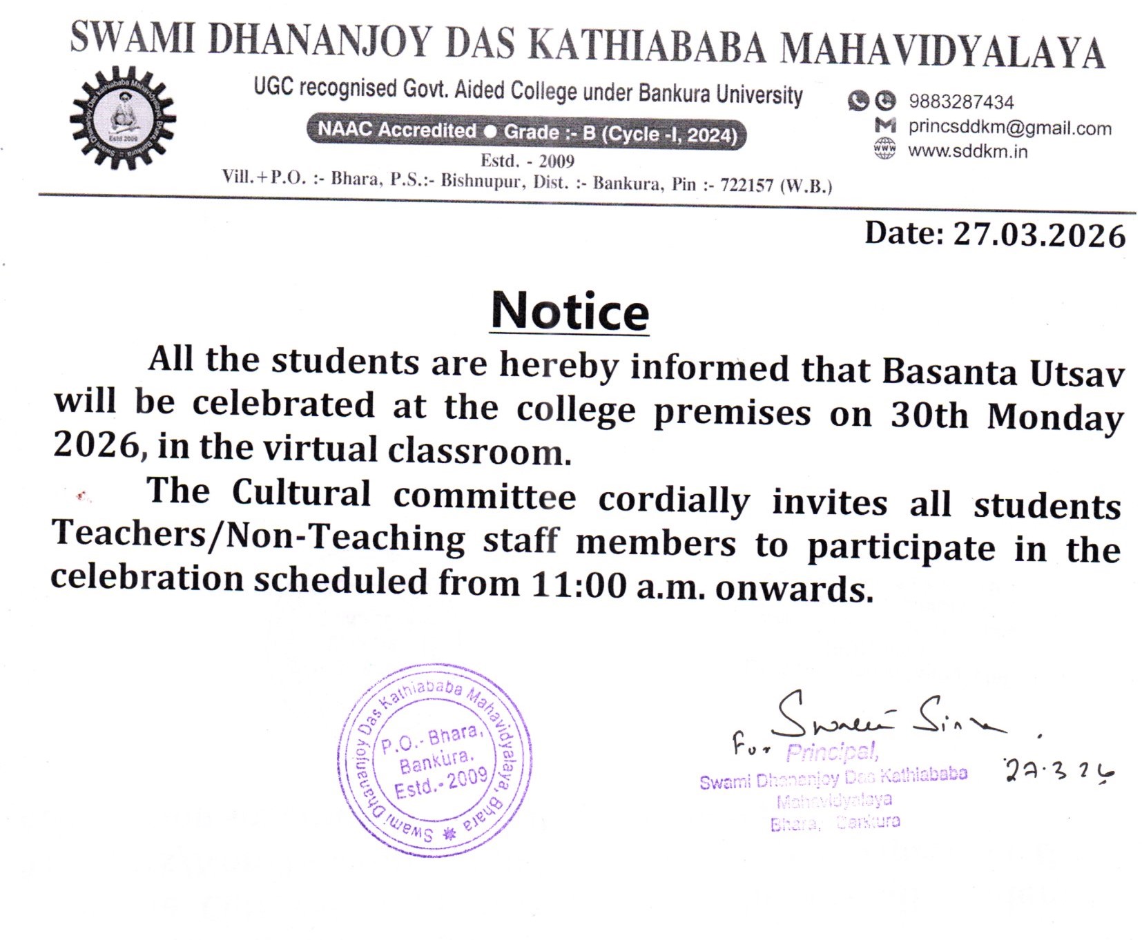 Holiday Notice for Birthday of Sri Harichand Thakur